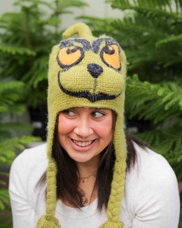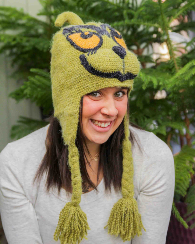 This festive and whimsical hat from the Peruvian Trading Company brings the mischievous spirit of Dr. Seuss's Grinch to life. The design captures the iconic look of The Grinch with the character's signature bright, mean green color, yellow eyes, and large smile. This hat features tassels hanging from the ear flaps, designed to be cozy and comfortable.