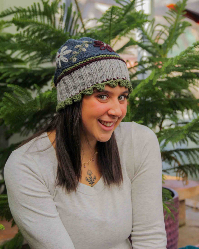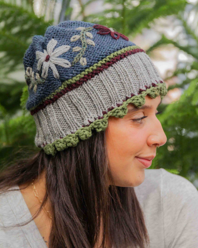 This enchanting hat is a beautiful example of traditional Peruvian artistry, hand-knitted by skilled artisans. Features an intricate flower and vine motif that is either hand-knitted directly into the main body of the hat. Designed as one-size-fits-most in the classic beanie/skull cap silhouette.