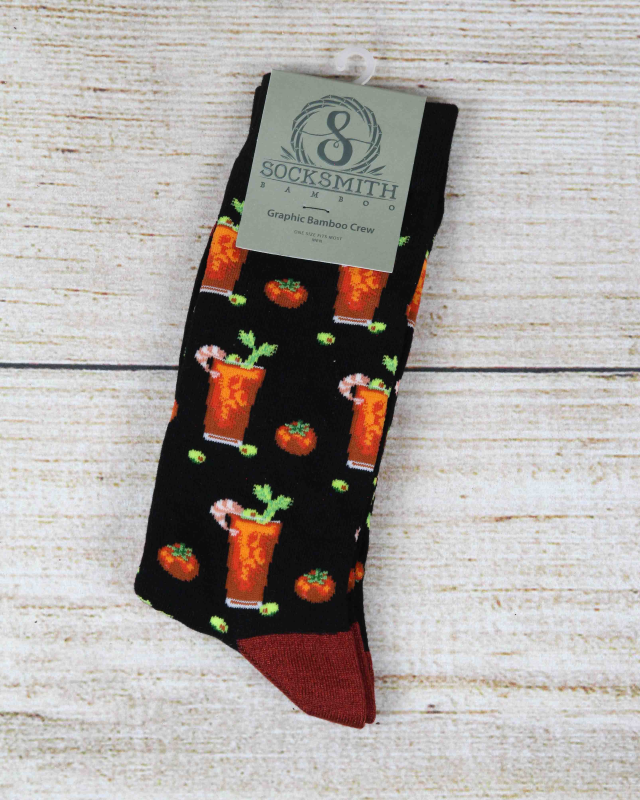 The Bloody Good Drink Men's Bamboo Crew Socks from Socksmith feature a clever and striking design inspired by a classic cocktail – the Bloody Mary. These socks are adorned with illustrations of cocktail glasses filled with the famous tomato-based drink, complete with celery stalks and olives. The design captures the essence of mixology and the allure of this iconic cocktail. Bamboo is known for its softness, moisture-wicking properties, and breathability, making these socks not only stylish but also exceptionally comfortable and environmentally conscious.