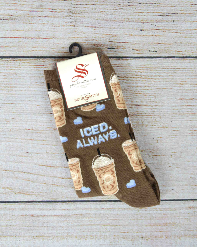Socksmith's Iced Always are crew socks designed for women who love iced coffee, even when the weather gets chilly. The socks themselves are a brown color with a white design that features an iced coffee cup and the phrase "Iced Always."