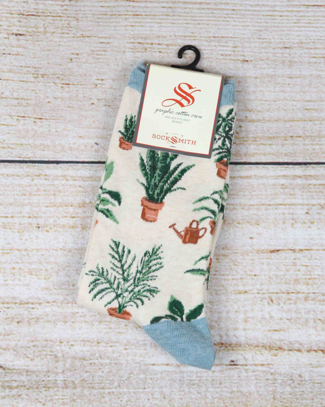 The Home Grown Women's Socks from Socksmith feature a heartwarming and nostalgic design inspired by the idea of home. The socks are adorned with illustrations of lush houseplants, including snake plants and palms, creating a picturesque scene that evokes feelings of comfort and serenity.