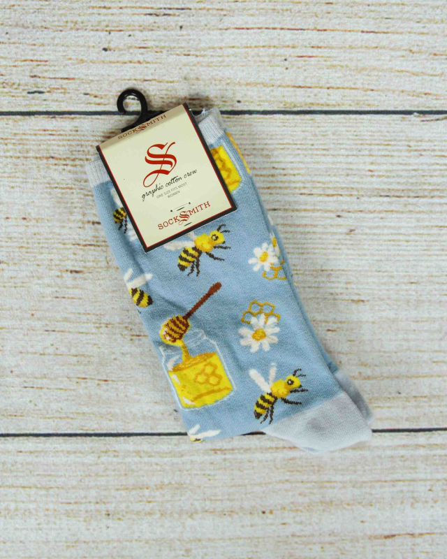 Add a touch of sweetness to your step with the charming Bee My Honey Women's Crew Socks from Socksmith. Featuring a vibrant blue base adorned with buzzing bumblebees and blooming sunflowers, these socks bring a touch of cheerful whimsy to your everyday look.