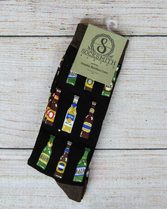 Socksmith's 99 Bottles are men's crew socks with a playful design that might remind you of the classic song "99 Bottles of Beer on the Wall." Made with a blend of rayon from bamboo, nylon, and spandex, these socks are designed for comfort. Bamboo is known for being breathable, anti-bacterial, and anti-fungal, keeping your feet feeling fresh.