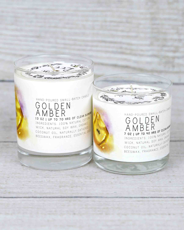 The Golden Amber Just Bee candle is described as a scent that weaves a tale of warmth and sophistication, radiating a sense of tranquility and timeless elegance. It features initial notes of soft musk, intriguing nuances of warm amber, and hints of weathered leather and vetiver. The candle is made with a blend of natural soy wax, organic coconut oil, and naturally gathered beeswax, and is designed to be aromatherapy grade and toxin-free.