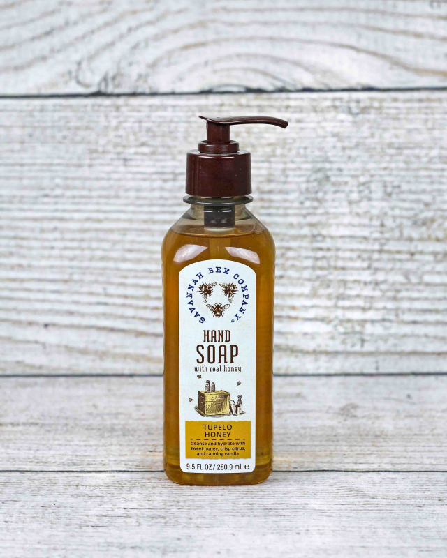 Savannah Bee Company Tupelo Honey Hand Soap is a liquid hand soap that is made with skin-softening pure honey. It is described as a gentle but highly effective cleanser, moisturizer, and softening agent. The soap also has a crisp citrus and warm vanilla fragrance.