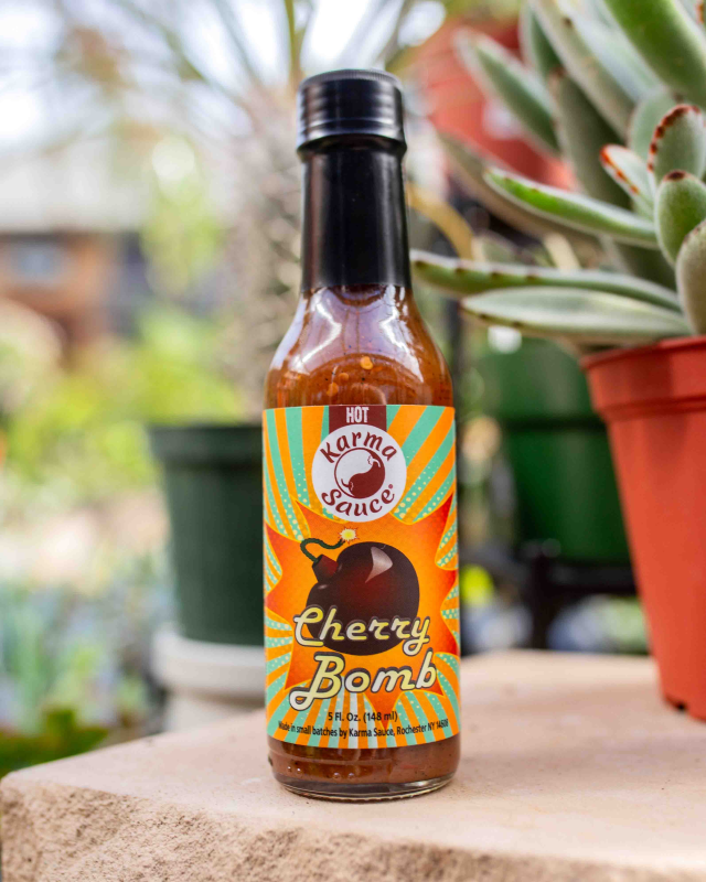 True to its name, this sauce takes heat-rich habanero chiles to a foundation of real sour cherries for a combination of fruity sweetness and unmistakable fire. Cherry Bomb is crafted with a bold blend of fresh, all-natural ingredients: Tart cherries, habanero pepper, onion, apple, apple cider vinegar, evaporated cane juice, lime juice, ground coffee, lemon zest, cinnamon, and clove.