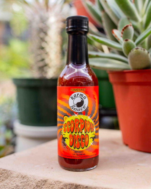 Scorpion Disco is crafted with a bold blend of fresh, all-natural ingredients: peppers (Trinidad Scorpion, Ghost, Chocolate Habanero, 7 Pot Primo), apple cider vinegar, cane sugar, fresh lime juice, salt, garlic, spices.