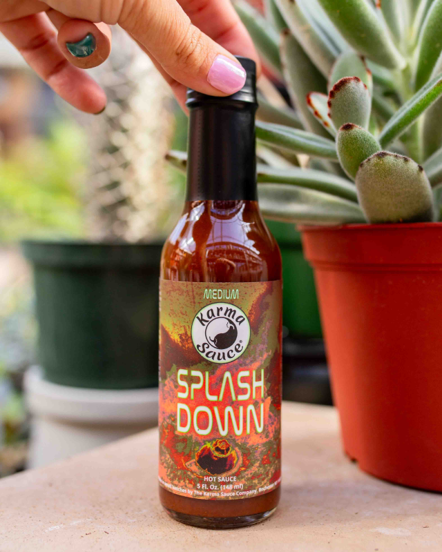 Splash Down is crafted with a bold blend of fresh, all-natural ingredients: red chiles, vinegar (infused with galangal, lemongrass and kaffir lime leaf), lime juice, coconut water, coconut sugar, garlic, salt, toasted onion, Thai chile flake, Thai basil, culantro, spices.
