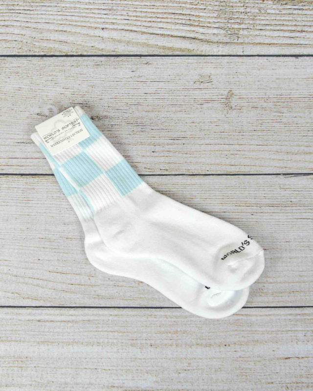 Don't pass up on the Crescent's World's Softest Socks! The World's Softest Socks in White and Checkered Blue are made from a blend of cotton, polyester, and spandex. They are machine washable, dryer safe, and perfect for every day wear.